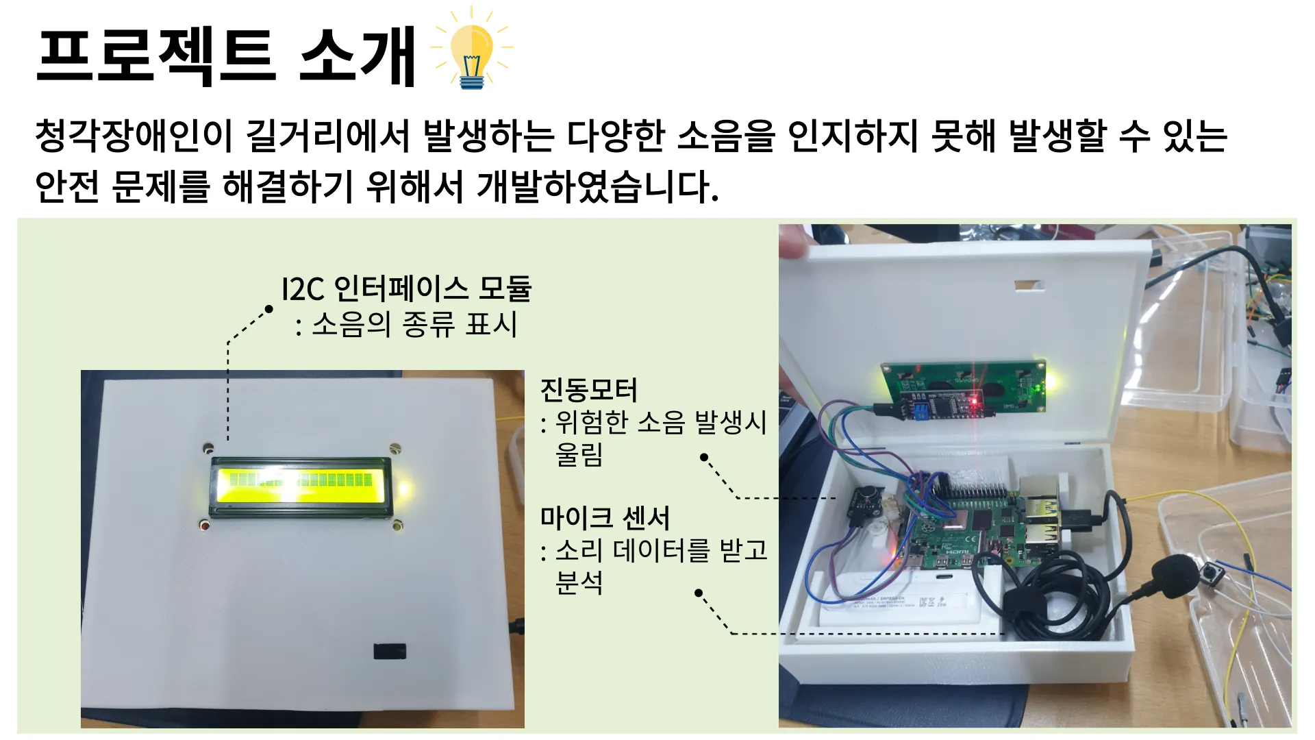 이번 프로젝트는 청각장애인들이 직면하는 위험을 인식하고 줄이기 위해 시작되었습니다. 청각장애인들은 주변의 위험한 소리를 듣지 못해 차량 충돌이나 기타 위험 상황에 노출될 가능성이 높습니다. 이러한 문제를 해결하고자 우리는 청각장애인들이 도보 환경에서 보다 안전하게 이동할 수 있도록 도와주는 임베디드 시스템을 개발하게 되었습니다.